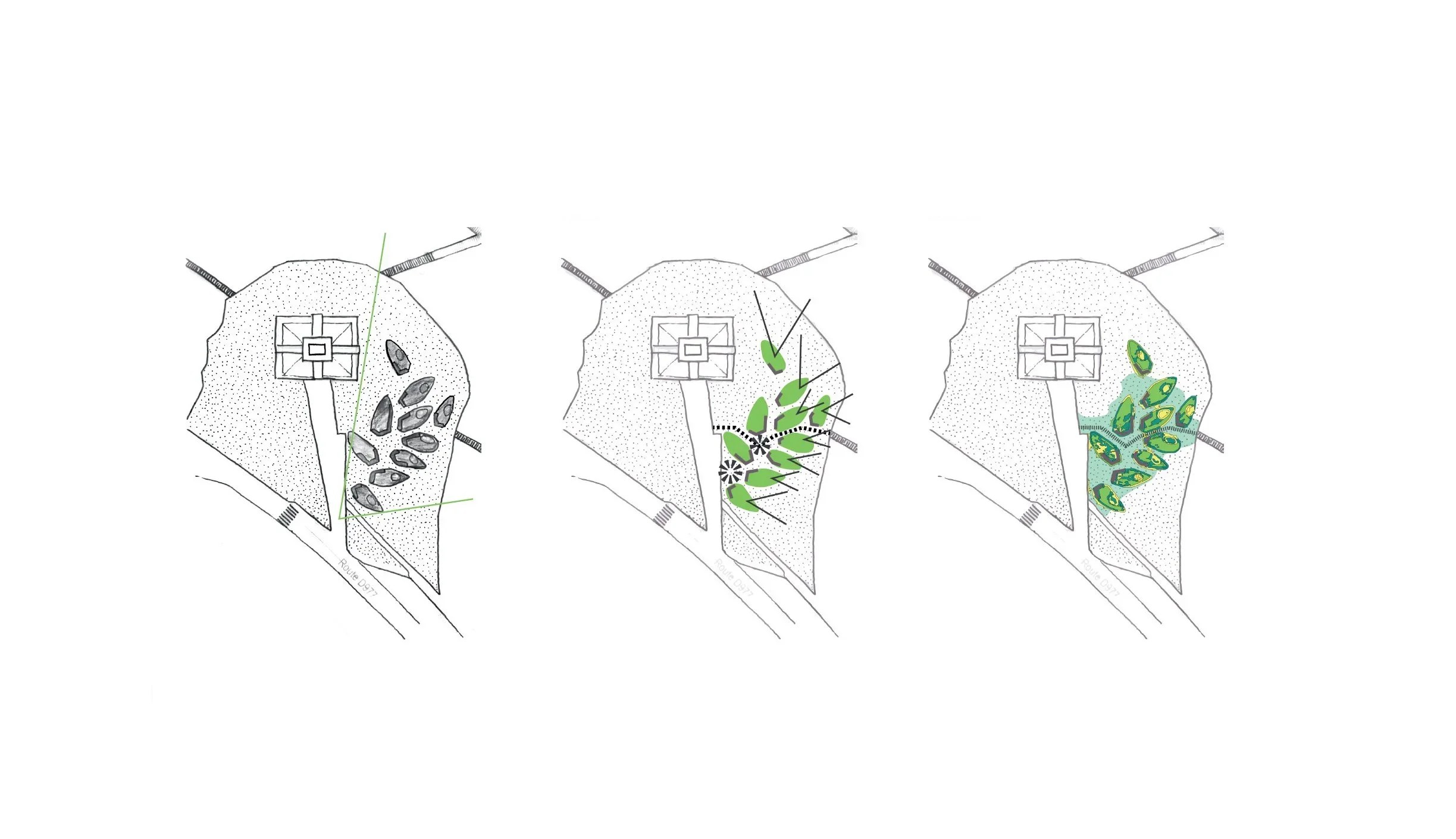 Inspiré des traces laissées par la guerre sur le paysage, le jardin reprend la symbolique de la ligne de front : des talus séparés par des dalles de pierre formant des “traits d’union”. Le visiteur peut circuler entre ces espaces et retrouver une perspective ouverte, là où la tranchée offrait autrefois un horizon fermé.