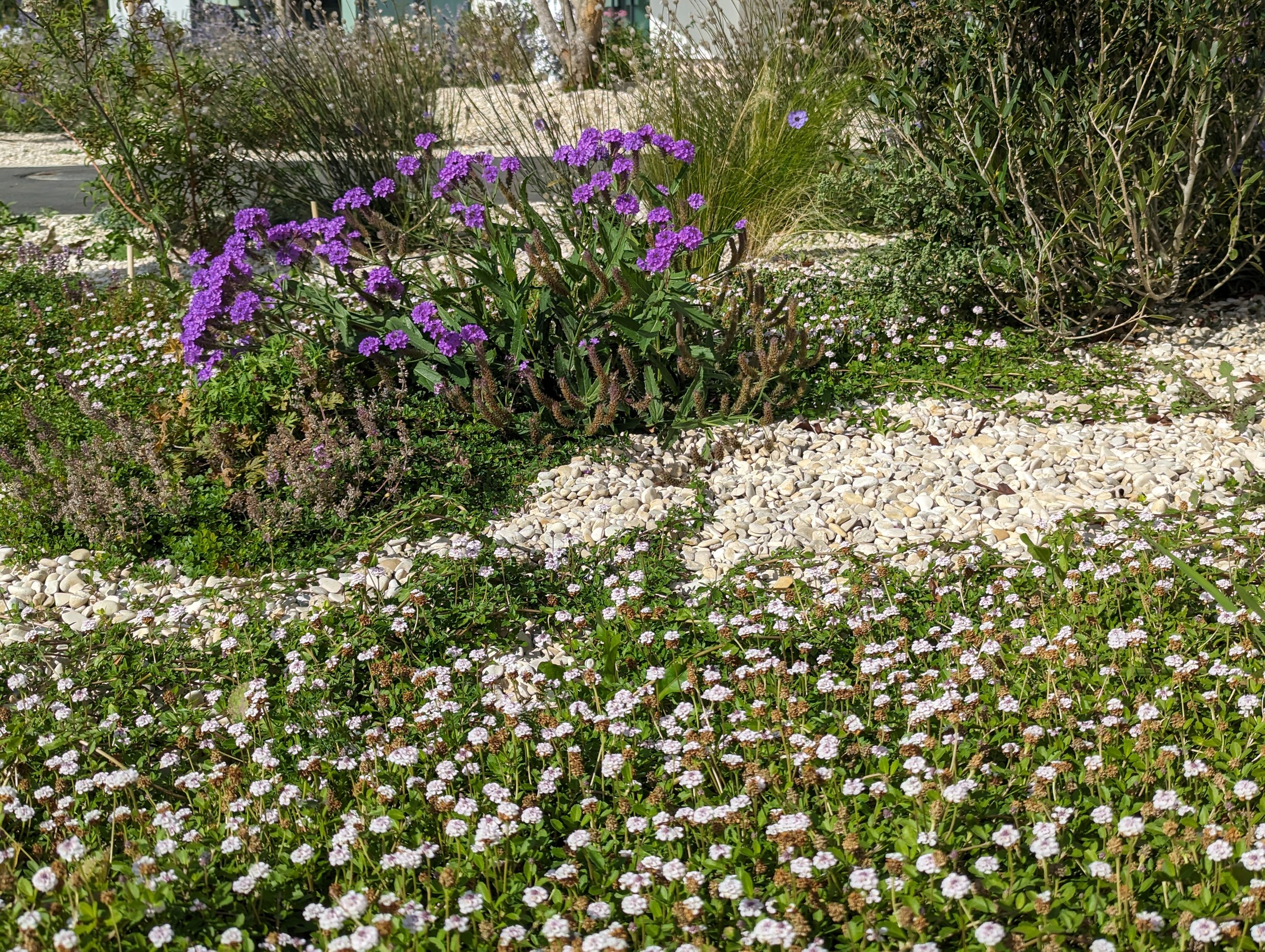 La palette végétale, composée de plantes indigènes et méditerranéennes, a été sélectionnée pour sa résistance à la sécheresse, sa capacité à survivre avec peu de substrat, et sa richesse écologique.