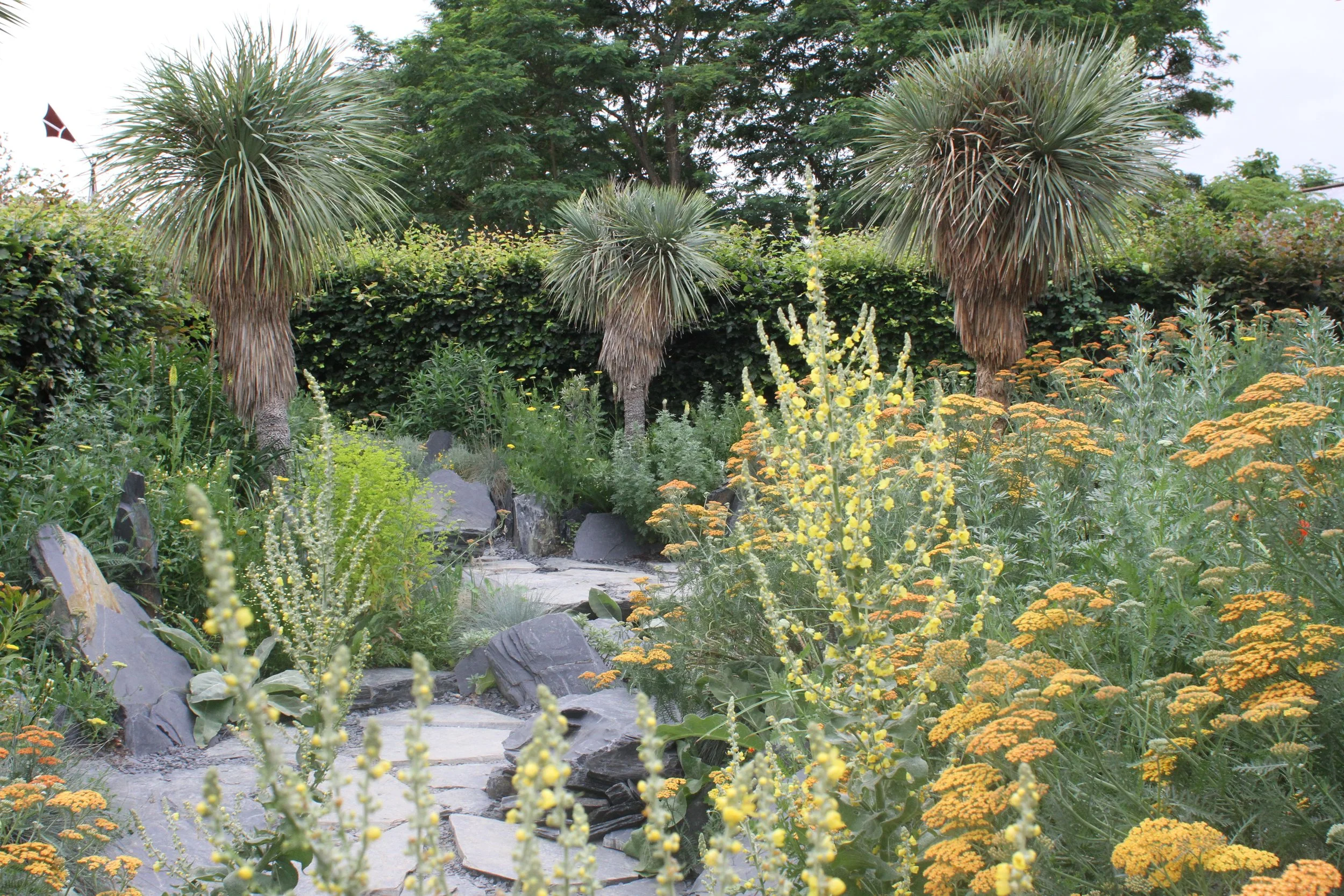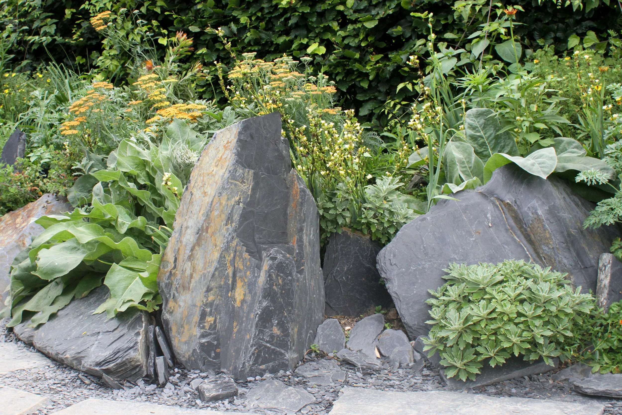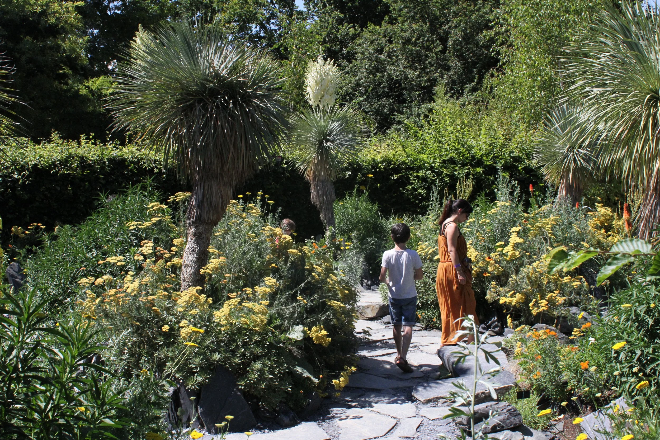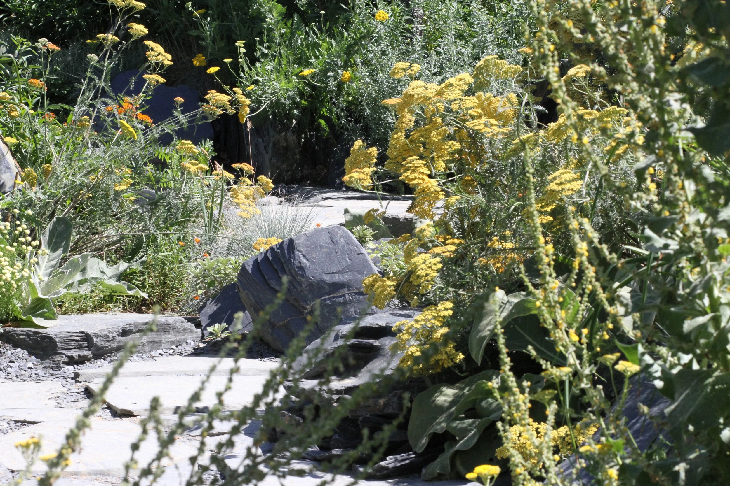 Le changement climatique provoqué par l’homme a éradiqué le monde des végétaux. La terre maltraitée se raréfie, le sol se minéralise, de larges dalles de schiste et d’ardoise se forment en surface. Les végétaux, dans leur élan vital, se rebellent, réagissent, prennent leur revanche. Ils brisent la croûte terrestre et s’élancent à la conquête de la lumière. Lors de sa promenade, le visiteur est surpris par les contrastes entre les minéraux sombres et les végétaux lumineux jaillissant du sol. Les formes des végétaux évoquent les mouvements de rupture, d’éruption, d’explosion et la dynamique de la terre qui s’ouvre et se fissure. En cherchant la lumière pour leur survie, les végétaux sont capables d’une remarquable inventivité de formes et de couleurs, et d’une énergie insoupçonnée. Ils brisent la croûte terrestre et provoquent failles et fractures. Les yuccas résistant à la sécheresse percent le sol, en créant de la place pour les substrats des herbacées, vivaces et autres annuelles adaptées au milieu ambiant plus chaud. Les couleurs à dominante orange et jaune évoquent les flammes, le feu et contrastent avec le noir des dalles. Le jardin du XXIème siècle est un hymne à la renaissance, au jaillissement et à l’élan vital du monde végétal.